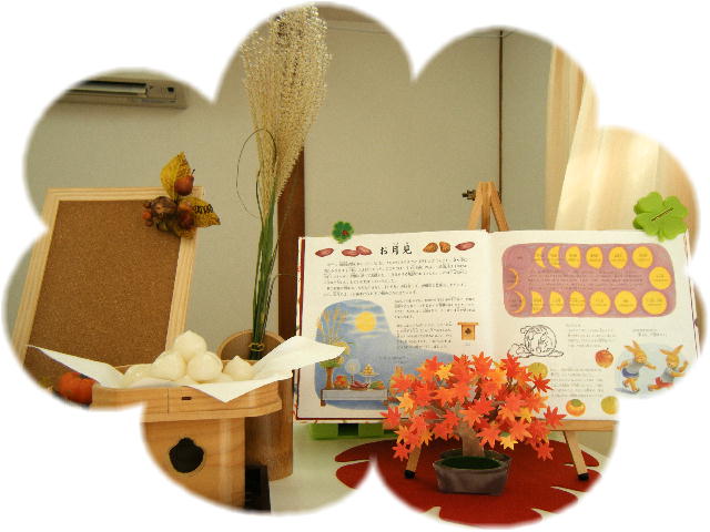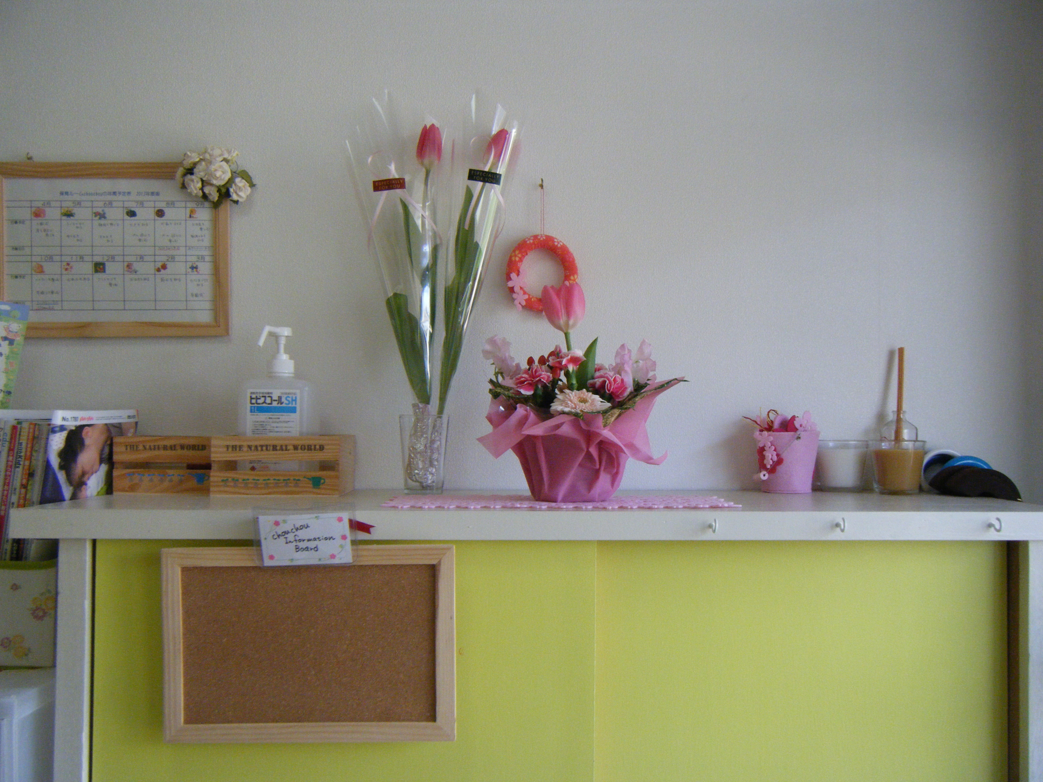 また、そのまま視線を少し左に移して頂くと年間行事予定や、その下には、おむつやお着替えといった、日々お持ち帰り頂くケース棚がございます | ||