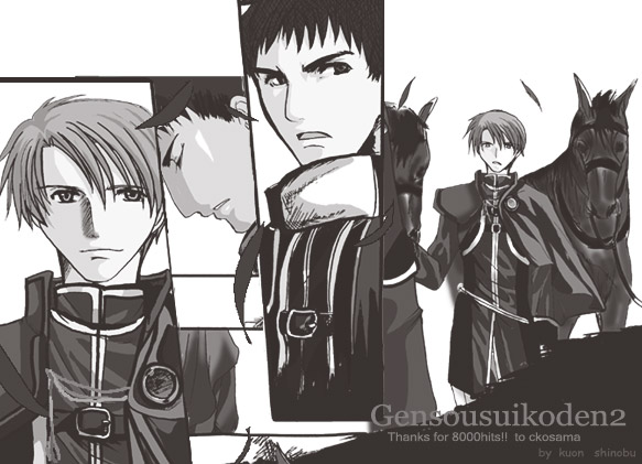 はい、C子様!!お待たせいたしました!! 8000Hitsありがとうございます!! 幻想水滸伝2「青赤団長‘S と 馬」がリクってことで… (はい、突っ込まない、突っ込まない) BACK 対のカラーが美しい団長方をこんなにしてしまって… すーみーまーせーん!!!!!!!!!