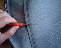 | まずは、型を取るためにすべての糸を ほどいていきます。 →の赤いのは裁縫用の糸ほどき?です(笑) |
