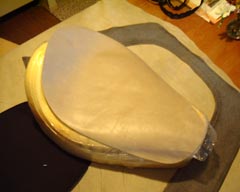 | バラしたシートを革にあてがって型取りします。 ずれないように注意注意! |