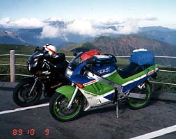 カワサキらしからぬ軽い車重と軽いエンジンフィーリング、そしてレプリカのようでいて実はツアラーという、まさに私みたいな中途ハンペンな者にうってつけのバイク。コイツは通勤だけぢゃなくて、九州・信州などへのロングツーリングの良き相棒にもなってくれた。そういやジムカーナのマネ事みたいなこともやったなあ。もちろんデートにも活躍してくれましたよ(まさに青春色ってやつだ)。
