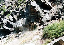 気を取り直して先を進む。いい加減ダートがイヤになったころに到着。先客は車が4・5台。おお、やはり朝早いと空いてます、まさにねらい通りって感じ。バイクを端っこに止めて、早速沢登り開始。まず1歩川に足を入れると・・・あったかい!これは感動ものだ、お湯が流れてるぞ!有頂天になって2歩目を踏み出した途端、ツルッと滑ってケツをしこたま打つ!痛ってえ〜!!川底は1枚岩のような滑らかな岩で、無謀にもそこをビーサンで登ろうとしていたのだ。これは危ない、と裸足で登り出す。しばらくして足の裏を切った(馬鹿丸出し)。結局、クツ下をはいて登る。これが一番安上がりで安全です。初めからこうしときゃよかった。登っていくにつれて、だんだんとお湯が熱くなってくる。よく見てみると横の岩からお湯が涌き出てます。まさに秘湯って感じですねえ。