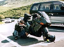 駐車場は満杯状態だったけど、1台分空きがあったのでそこへ頭から突入。そこは右前に向かって傾斜しており、サイドスタンド立てたらほぼ直立状態。止めた段階でギアを入れんとヤバいかもって予感があったけど、その場では大して気にせず右側へ回ってカメラをゴソゴソ。そしたら予感的中!ZZRはズズッと前へ勝手に進むではあーりませんか!「うおっ?!」。咄嗟にハンドルに手を伸ばして自分側へ勢いよく引いてしまったので、一気に車重が私の体へ(汗)。「ぐおおおっ?!」。突然の出来事に私の体は耐え切れず、哀れバイクと地面のサンドイッチに(笑)。挟まって身動きできない私を見かねた観光客のオッサン連中が、私とバイクを起こしてくれました。うえー、メッチャカッコ悪いでやんの(苦笑)。