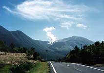 はやる気持ちを押さえつつ、山上レストハウスに到着。さあこっから一気に町営道路通って火口だーっと勇んで進んでみれば、なんとガス発生の為通行止めだと!そ、そんなあ〜!せっかく楽しみにしてたのにぃ!(涙)。しかしゴネたところで登れる訳でもなし、力も抜けちゃってそのまま休憩。仕方ないんでそこから阿蘇をバックに来たという証拠写真を撮りました。それにしてもせっかく前まで来て登れないとは、ほんと残念だなあ。まあ次回のお楽しみってことですね。