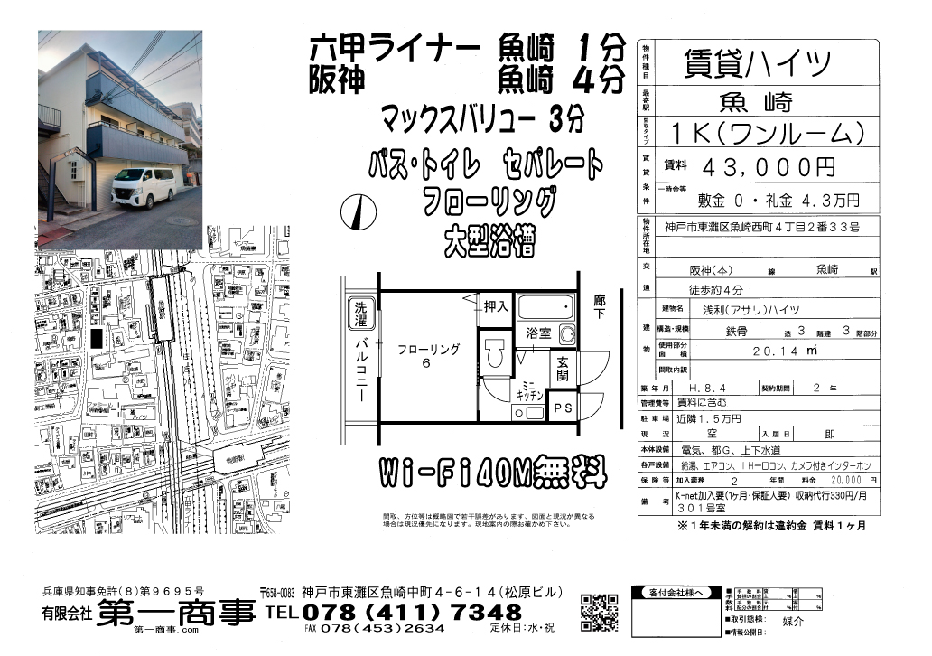 阪神魚崎6分 | 100/99万円 | 29.7万円 | なし | 詳細 業種制限有 飲食・食品販売等不可 |
