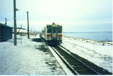 寒さでピンと張り詰めた空気の中を北浜駅に向かう。オホーツクに面した釧網線の北浜駅はマッチ箱のような建物だ。網走番外地という映画を撮るときにこの駅舎を網走駅として使ったのだ、寂しさを狙うために。 現在駅舎は無人で舎内を改装して喫茶店を兼ねている。建物の脇にはここの最後の駅長が作ったオホーツクに一番近い駅という碑が立っている。