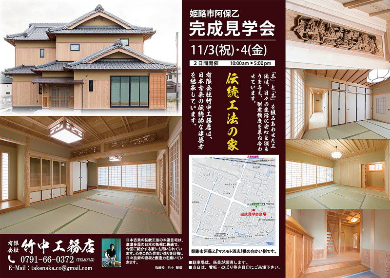 開催日多数ご来場ありがとうございました。大盛況で無事に終了しました。平成28年11月3(祝)、4(金) 場所兵庫県姫路市阿保乙 開催時間10:00~17:00 TEL0791-66-0372 メールアドレスtakenaka.co@gmail.com 担当者竹中 賢樹