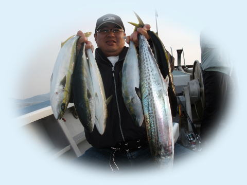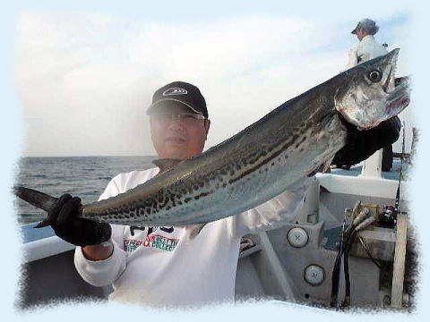 午後3時くらいから一気にヒットが集中的に出始めました。リズム感を取り戻しつつあったので、私もジグを再度、ソーリー180gのロングタイプにチェンジし、101mラインのドテラ流しに挑みました。ジグが着底し、シャクリを開始して数回シャクッたところで今までとは少々違ったひったくるようなアタリが出ました。ハマチでないことはすぐにわかりましたが、メジロやブリでないこともわかりました。寄せてくると、船長からも「今の時期には珍しいなあ」と言われましたが、良型のサワラでした。90cmほどありました。「う〜ん、満足、満足!」