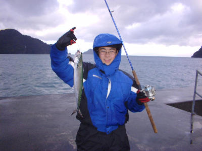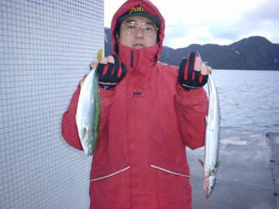 ジョナサンが卑弥呼42グラムピンクをキャストすること2投目のフォール中、フッとテンションがなくなり、「もしや?」と思ってチェックすると・・・ジグが無い!(^_^;) サゴシが居ることを確信。すぐさま1分かかるかかからないかでリーダーを再セット(オフショアノット改)。気を取り直してキャストを再開した途端、「お父さん、何か来た!」と隣りでスピードジグ42グラムブルーをキャストしていたジョナサンJr.の声。 内心「先にヤラレてしまった。」と焦りながらも「ゆっくり、ゆっくりやればいい! そうだ! そこで一気に抜き上げろ!」と余裕をかましたようにアドバイス。 揚がって来たのは35cm程のツバス!