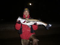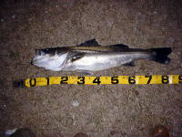 まずはアイマ・コモモで様子を見るがアタリも何にもなし。今度はサイズダウンを図ってサスケにチェンジ。しかし、結果は同じ。ん〜、今度は・・・とルアーをゴソゴソしていると、下流に立ち込んでいた先客アングラーにヒット!(やられた〜!と思ったが、35cmほどのセイゴ。内心「俺の狙いはそんなんじゃないさ!」とホッとしたというか、自分に言い聞かせ冷静を保った) 「でもヒットしてイイですね!私なんかアタリすらないですよ。」と、場を繕ってキャストを再開。ルアーはシャロートプスに替えていた。するとそこへ常連の矢●氏がやって来た。私の少し上流に陣取り慣れたキャストを開始。5分もしないうちに「よし!」の声とともにバシャバシャッと音がした。そこそこのシーバスだ。先ほどの魚の倍はある。なんと65cmほどらしい。魚をストリンガーにぶら下げてキャスト再開。