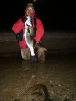 気分を変えよう!とジョナサンは橋立独特の急流で何が一番いいかと思案した末、ケースからグース125FのクリアーRHを取り出し、流れが速くなりだした海にキャスト。流れの向こうに投げてナチュラルドリフト〜U字釣法で狙うことにした。 ジャジャ〜ン! これが大正解!! キャストからリトりーブを始めて3回も巻いただろうか。ルアーが流れている方向で「バシャ!」という炸裂音とともにロッドにギューンと重みが伝わり、ビシッと合わせ入れる。「ヤッター!」と、思わず叫んでしまった自分が大人げなく恥ずかしかったがそれ以上に嬉しかった。本当に嬉しかった。慎重且つ楽しみながら引き寄せ、ギャフを打とうかどうしようかと迷いながらも体は岸の方へ後ずさりしていて、最後はそのまま岸へズリ上げていた。デカイ! ランカーだ!\(^o^)/ 手尺で80は優に超えている。離れたポイントに入っていたトラさんに電話。すぐにやって来たトラさんに祝福してもらって、固〜い握手。編集部の杉田氏に電話で報告。氏も声を裏返して大喜びしてくれた。