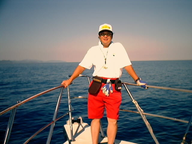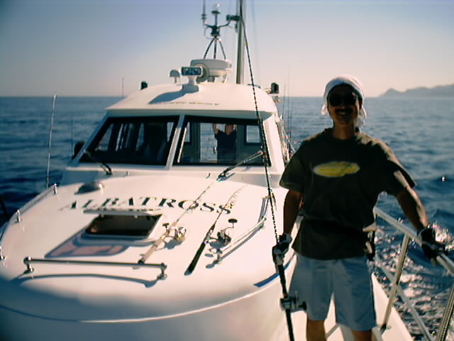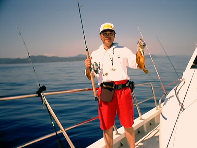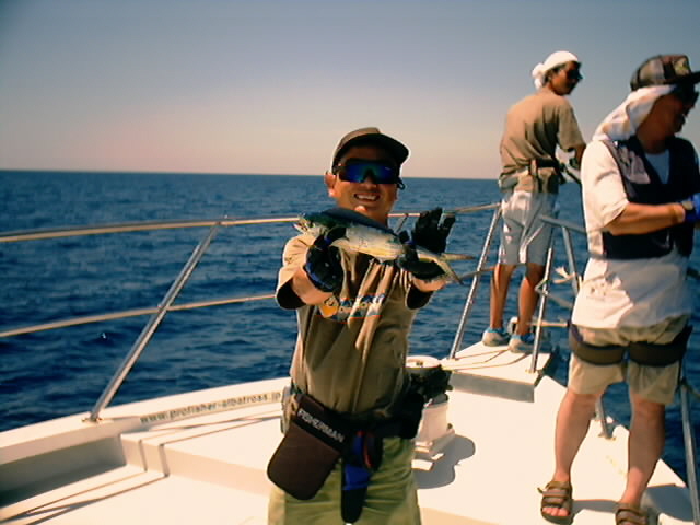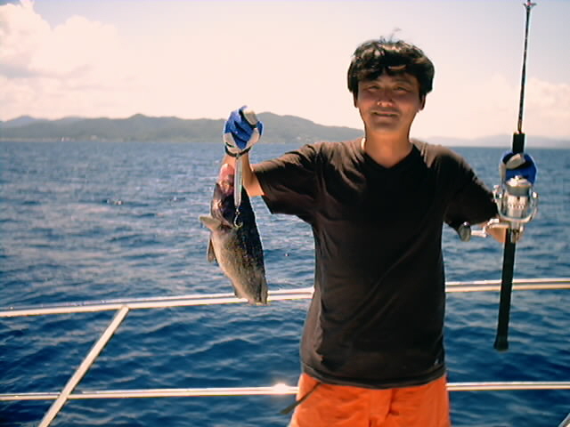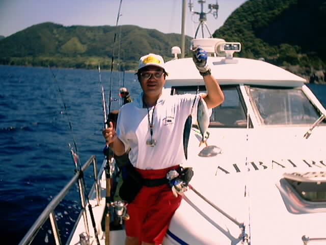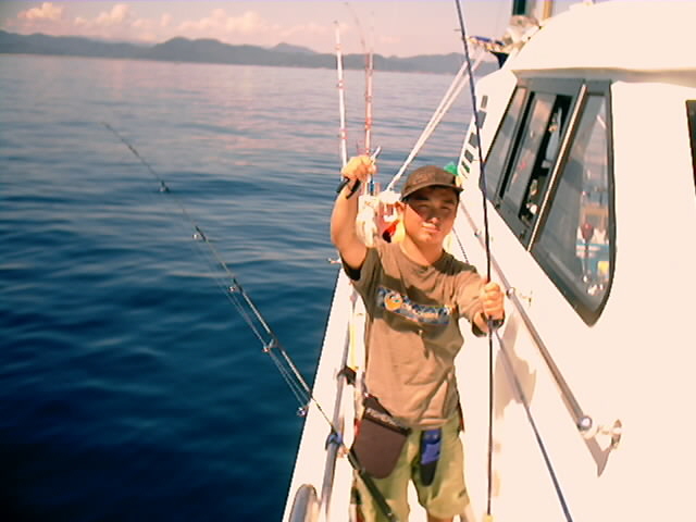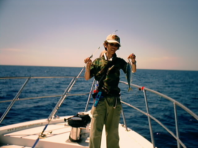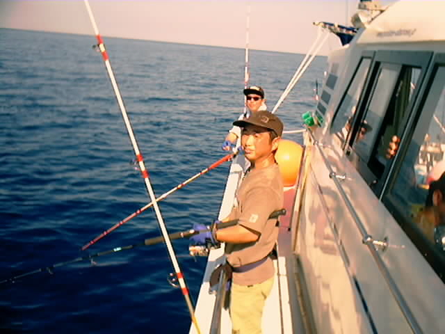 12:28、そのホリホリさんが30センチほどのシイラをキャッチ。一瞬苦笑いを浮かべながらも満足そうである。キャプテンも小物ばかりのパラパラヒットに嫌気をさしたのだろうか?15分ほど大移動しますとのコール!それにしてもこの船は足が速い!他の船なら30分以上は確実にかかるであろう移動をアッと言う間にやってのけるのだから大したものだ。今度は犬崎・竹野方面へ移動。ヒラマサ狙いに転向(?)ジョナサンは船首で気持ち良く海の風を満喫していた。このころから午前中の無風とは打って変わって気持ちよい風が吹き出した。しかし、潮は風とは逆方向に流れ釣りはなかなか難しい。