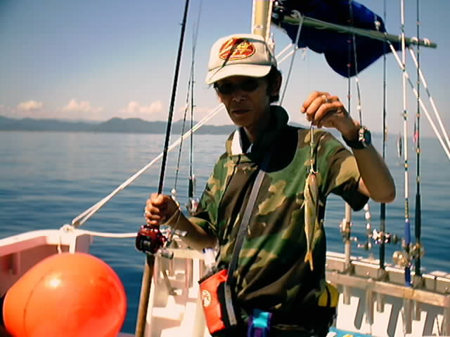 4:02、遂に本日初キャッチとなるオッチャンにシイラ25センチが来た。あ〜良かったぁ!これで全員ボウズなしだ。小物相手ではあったが大いに楽しませて貰いました。