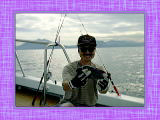 鳥山もいくつも出たがそのうちの幾つかは小さな飛び魚の群れが飛んでいるのを追ってのものであった。30センチ前後までのソイ、同サイズのガシラ、30〜50センチのアコウ、が各々数尾、これが船中全体での今日の釣果だった。他の船もたくさん来ていたが魚を上げる光景は一度だけだった。魚は釣れない。昼前からは、昨夜からの激しい雨も嘘のようにカンカン照り。午後1時、遠くに大きなものが水面を飛び跳ねるのを目撃。何とイルカの大群。1:10分。船長がアングラー一人一人に許可を求めて、小浜沖へ戻ってコマサ・メジロ・サゴシを釣ることになった。「今日の玄達は最悪や。小浜へ帰った方が固い!」と、肩を落とす船長。