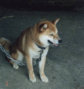 酪農家の牛舎につながれている愛想のいいワンコです。