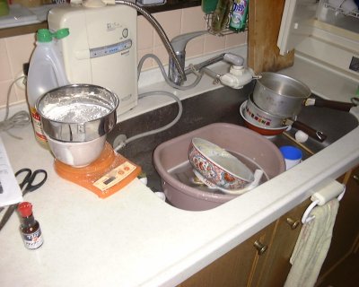 | 番外…御菓子作りは台所が汚れるってのは本当でした…(;´д`)トホホ ウチにはボールが無かったのであるもので代用しました。荒い桶に浸かってる鉢がソレです。 |