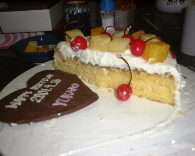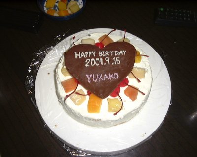 | 日付は生まれ年を書くと後々恐そうなんで今年の誕生日としました。 本当はイチゴが良かったんですがこの時期ないですからトロピカルフルーツとチェリーで飾り付けをしました。 |