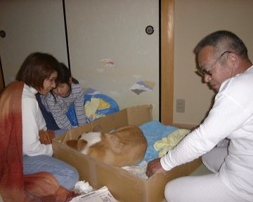 | 出産風景…あいんは家族に囲まれてても平気で出産しました。 でもミーちゃんだけは非常に警戒してました。 |