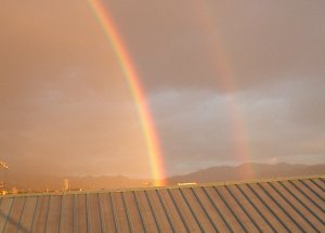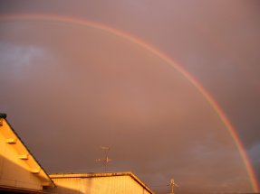 抜けて行った後、夕焼けに染まった空に大きな虹が出ていました。