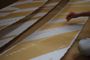 11. 蒸しをし、糸目を洗い流し、湯のしをした生地に金箔、銀箔を貼ります。