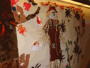 Halloweenの時期で、子供たちは、black cat のお絵かきやscarecrow(写真上右)を製作中でした。 story time は先生のお話の時間。教室の一角にカーペットが敷いてあり、ソファが置いてます。そこで輪になり、目を輝かせお話を聞いています。この日はspiderの絵本でした。本を読む前に先生がテーマについて、色々なかたちでアプローチします。例えば、おもちゃのspider(結構リアルなものでした)を子供たちの頭に一人ずつ乗せてHow do you feel? と聞いていきます。 子供たちは、次は私の番かな?って感じでドキドキしながら待つ姿がとてもかわいらしかったです。 絵本を読む前の導入の方法がとても勉強になりました。 |