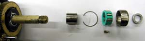 シャフトリティナーを外して分解した状態の画像です、シャフトカーラーは標準には黄銅色の(BC9×5×3)メタルベアですがステンレスボールベアリング(SMR95ZZ)と交換が出来ます。 クラッチカムプレートのネジ(トラス)1本を外します。 |