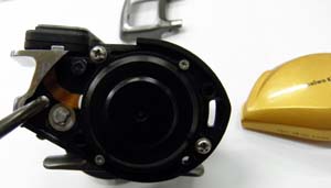 クラッチ押しバネ2本、ピニオンギャーとクラッチプレートとワッシャー2枚付、ラインストッパー、クラッチカムレバー、カムキックバネ、を外す。 |