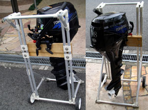 スペーシア継手部材とアルミパイプ(規格は28×2)を使ったエンジンスタンド、トーハツ4スト9.8PS-L足専用のカスタム。 |