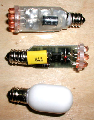 一般照明機具(シーリングライト)には豆球が使用されているのが一般的、ナツメ球と称され低価格で入手出来るが、白熱球の為に3〜5ワットの消費電力が必要で、さらに短命。 |