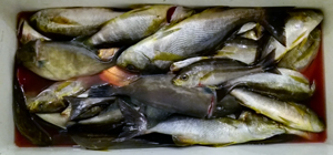 水温21.5度、大潮、潮微東流れ、イサキ3匹、チダイ3匹、ヒラマサ1匹(60センチの小政)、シイラ1匹、ウマズラハゲ30匹(肝枯れ)