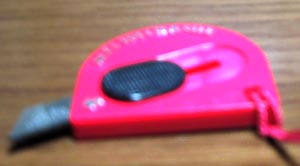 | カッター 長さ 4cm ・ 幅 3,5cm ・ 重さ5g 黒い所を押してカッターの刃を出す。 ビニール袋・紙袋・封筒など何でも開けるのに大出場します。 |
