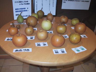 梨記念館 倉吉に平成13年春オープンした施設で 梨をテーマにした日本で唯一つのテーマミュージアムです。 二十世紀梨の巨木や昭和初期の梨農家を再現した建物、 梨にまつわる童話・詩歌の展示、梨と世界の人々の展示 梨の種類の多さにビックリしました。 |