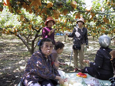 梨狩り いよいよ梨狩り、私達の手で獲れるのだろうか ? 「食べ放題」と聞いてもどうして剥くの・・・ 疑問いっぱいも一挙解決 手を取ってもぎ取らせてもらい、剥いてくださり、食べるだけ・・・ |