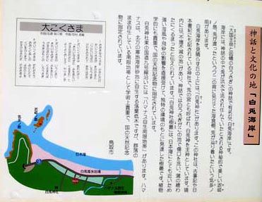 白兎海岸 翌日・因幡の白兎伝説で知られる白兎海岸で停車 道路の無効側なので、渡る事は出来ず写真におさめる。 ![]() 白兎海岸の説明立て札 |