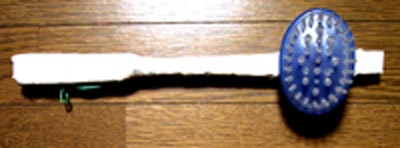 | トイレレバーを作る 長さ30cm ・ 幅 (直径) 2cm ・ 重さ90g 公衆のトイレにはいって何に困るか 用を足した後流すのに硬くてレバーが動かない時 作り方 1 , パイプに針金を二つ折りにして通します。 2 , わさになっていない方の針金にクリップを折り曲げて付けます。 3 , そのクリップをパイプに掛けて出来上がりです。 使用方法 パイプをトイレのレバーに差し込み、針金を前にひっ掛ける。 トイレのレバーが軽く押せます。 これで自動で流すトイレやボタンの流すトイレでなくても安心です。 シャンプブラシを作る 用意するもの 竹の長い菜箸・ローソク・シャンプブラシ・ビニールテープ 長い菜箸をローソクでカーブさせる。(自分に合わせて) 市販のシャンプブラシを菜箸ではさむ これにビニールテープを巻きながら持手も太くして出来上がり ![]() シャンプブラシの応用 ブラシの替わりにスポンジを付けて背中洗いを作る。 |