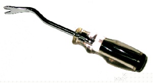 | 車の内張りなどを止めている樹脂リベットを外すための専用工具。 先端のくぼみを樹脂リベットの軸に食込ませて、写真の曲がっている部分を利用して、てこのようにリベットを引上げる。 さすが専用工具だけ有ってうまく外せる。内装を分解する人には必需品。 マイナスドライバーなどでこじると、傷だらけになってうまくいかない。 |