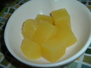 粉寒天2g、水300CC、缶詰の汁100CC 寒天を少し流し固めてから黄桃を並べてから残りを寒天を入れる 黄桃の甘さがきいてて食べやすい寒天です。 TOPへ |