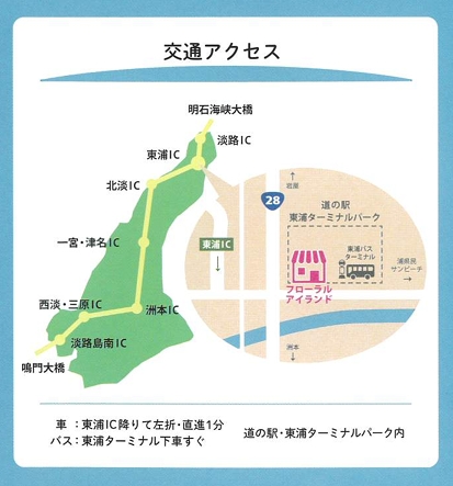 株式会社フローラルアイランド 〒656-2305 兵庫県淡路市浦642-1 TEL.0799-75-2387 アクセス 電車の場合 JR舞子駅、JR新神戸駅から高速バス 東浦バスターミナル下車すぐ。 自動車の場合 東浦インターチェンジからから降りて左折、直進1分。 ※道の駅駐車場(無料) ※市営駐車場(2時間無料)