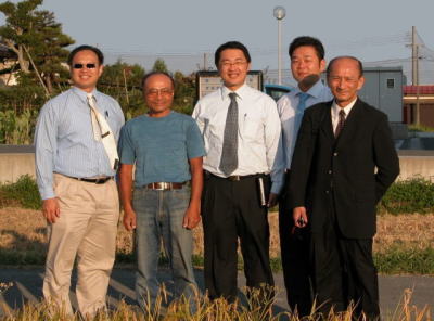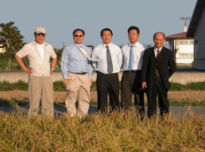 | 残念ながらニュートリスマートを使った圃場は、今年の稲の登熟が早くて刈り取りには間に合いませんでしたが、問屋である高岡屋さんの梅沢部長の案内で、メーカーの長江生命科技国際有限公社(香港)からお二人、住友商事と住商農産のお二人が来られました(写真・左から)。 |