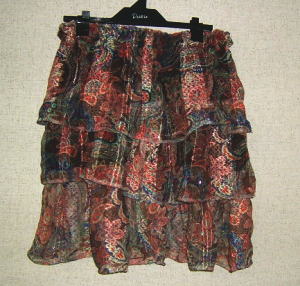 ネット地で スパンコールが入った面白い布で 嫁のスカートを作りました。 この前 綿の布で作ったスカートを気に入ってくれたので 同じ形のスカートを作りました。 綿のスカートは少し重い感じがしたので ネット地の軽い布で作りました。 3段になっているので 中は黒の夏用の裏地を使っています。 下にジーンズをはいたりレギンスをはいたりするそうです。