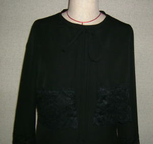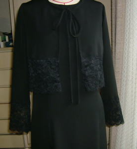 お客様のお母様の喪服で ワンピースとボレロのアンサンブルを作りました。 私のを見て すごく気に入って ご注文いただきました。 ノースリーブのAラインのワンピースと ボレロの裾と袖の裾に幅広の レースをつけています。 とてもスリムな方で シーチングで仮縫いをして 体にぴったりとフィットした ワンピースが仕上がりました。 ・