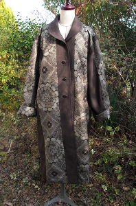 大きな柄の大島とこげ茶の無地の紬でコートを作りました。 この大島をいただいた方にコートを作りました。 無地のところに柄の一部を丸くアップリケしています。 袖口の折り返しにも大島を使っています。 ポケットは両脇に脇ポケットを付けています。 着丈110cm 裏は赤がお好きなので 赤の絞りの羽織を使っています。