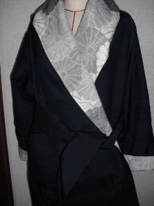 紺無地の紬と明るいグレイの紬でリバーシブルコートを作りました。 菊の模様のグレイの紬で 紺との相性がすごく良い明るいグレイです。 フード付きではないけど 大きな衿のコートです! 紺色のベルトを付けています。 着丈116㎝ ベルトはしないでフワッと着るほうがお洒落な感じです。