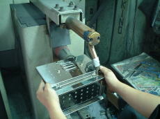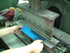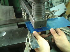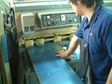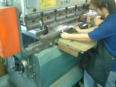 シャーリング(左図)という機械によって、必要な大きさに切断します。 |