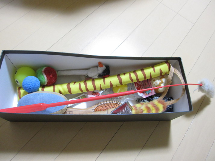 | おもちゃ箱 | 我が家で人気のおもちゃ おみつ ひも ちゃんと遊んであげないと、 くわえて水につけに行きます。 伝吉 ピンクの猫じゃらし この猫じゃらしを始めて見た時、 嬉しすぎて?毛の部分をくわえたまま 1階と2階を何往復もしました。 喜六 遊べる物なら何でもOK 放っておくと、おもちゃも、部屋も メチャメチャにしてしまうので、要注意です。 清八 音のする筒袋 派手な音を立てて、激しい一人遊びをします。 独り言を言いながら遊びます。 |