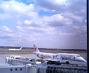 2006年4月21日札幌・新千歳空港にて撮影。 広報部員が、出張で新千歳空港へ行き、仕事の合間に空港見学をしていたところで発見しました。まだ寒い時期の北海道に似つかわしくないトロピカルな飛行機でした。 ちなみにリゾッチャの後ろに写っている飛行機は、小さくてわかりにくいのですが、ANAのポケモンジェット'99(B767-300)です。