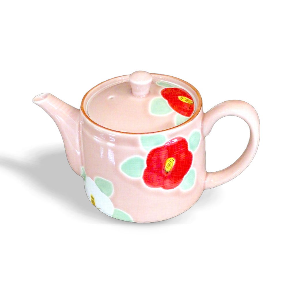 椿にピンクの珍しい配色のポット。鮮やかな手描きの一品です。
