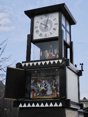 写真は息継ぎ井戸の横のカラクリ時計。時間になると殿中松の廊下