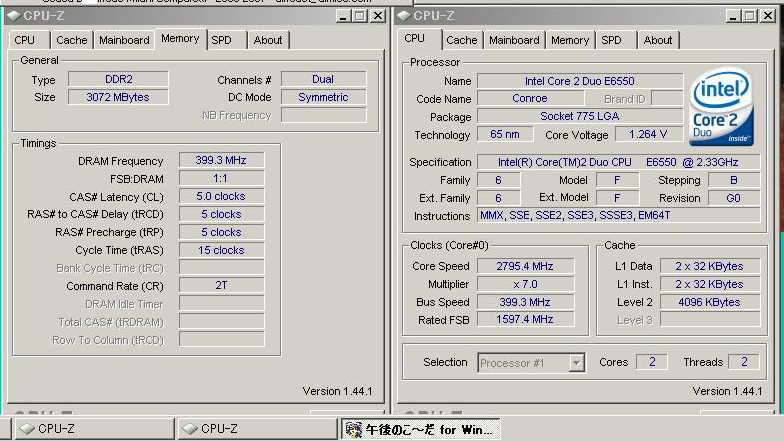 元々のメモリーが、DDR2-667,512×2だったので、合計3GBで使うために、下の設定に書き換え、3GHz