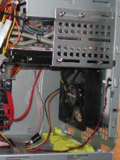 RearCaseFanにshort-cutするだけだ。そこで、front-panelに穴明け加工をし、HDDを水平に取り付け、